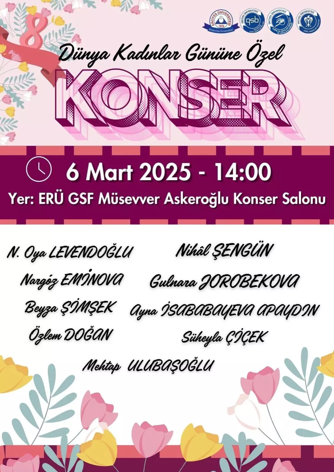 Erciyes Üniversitesi Güzel Sanatlar Fakültesi ve Kadın Çalışmaları Araştırma ve Uygulama Merkezi (KAÇAUM) tarafından düzenlenen etkinlikte, “Kadın Olmak” temalı fotoğraf sergisi ve özel bir konserle kadınların gücü ve sanatın birleştirici etkisi vurgulandı. Erciyes Üniversitesi Güzel Sanatlar Fakültesi ve Kadın Çalışmaları Araştırma ve Uygulama Merkezi (KAÇAUM) iş birliğiyle 8 Mart Dünya Kadınlar Günü dolayısıyla etkinlikler gerçekleştirildi Güzel Sanatlar Fakültesi Müsevver Askeroğlu Konser Salonunda düzenlenen etkinliğe, Güzel Sanatlar Fakültesi Dekanı Prof. Dr. Oya Levendoğlu, Güzel Sanatlar Fakültesi öğretim üyesi Öğr. Gör. Nihal Şengün, KAÇAUM Müdürü Doç. Dr. Meltem Şahin Hassan ile akademisyenler ve öğrenciler katıldı. Program, Fuaye Alanı’nda Öğr. Gör. Uğur Aydın tarafından hazırlanan “Kadın Olmak” temalı fotoğraf sergisinin açılışıyla başladı. Sergide, kadın kimliği ve toplumsal rollerine dair güçlü görsel anlatımlar yer aldı.