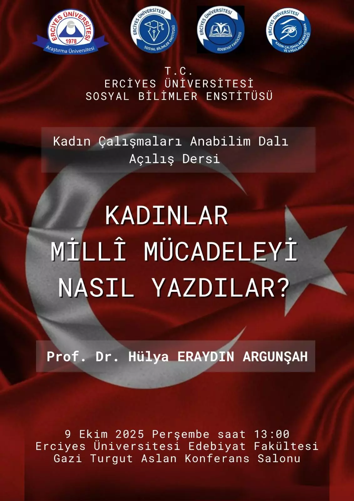 Erciyes Üniversitesi Sosyal Bilimler Enstitüsü Kadın Çalışmaları Ana Bilim Dalı ve Kadın Çalışmaları Araştırma ve Uygulama Merkezi (KAÇAUM) ortaklığında 9 Ekim 2025 tarihinde Edebiyat Fakültesi Gazi Turgut Aslan Konferans Salonunda 2025-2026 Akademik Yılı Açılış Dersi yapıldı.